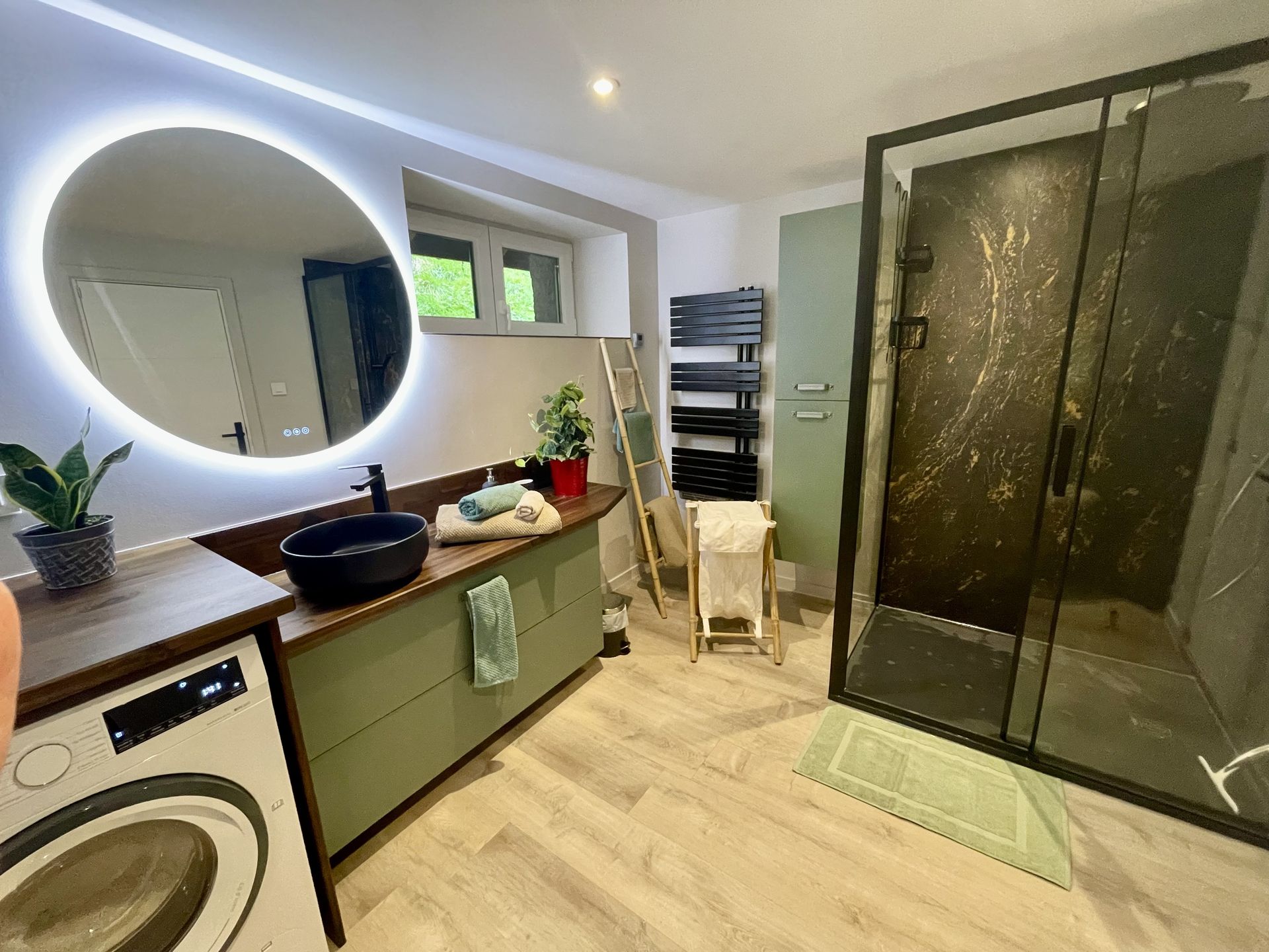 douche à l'italienne, machine à laver séchante, sèche cheveux